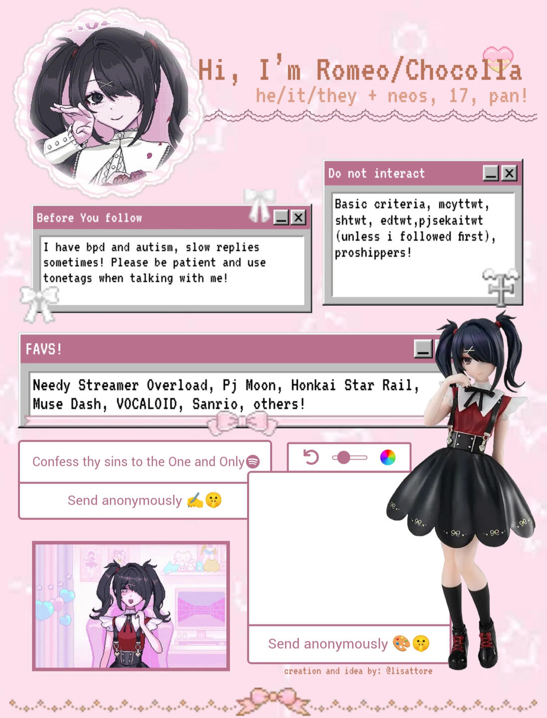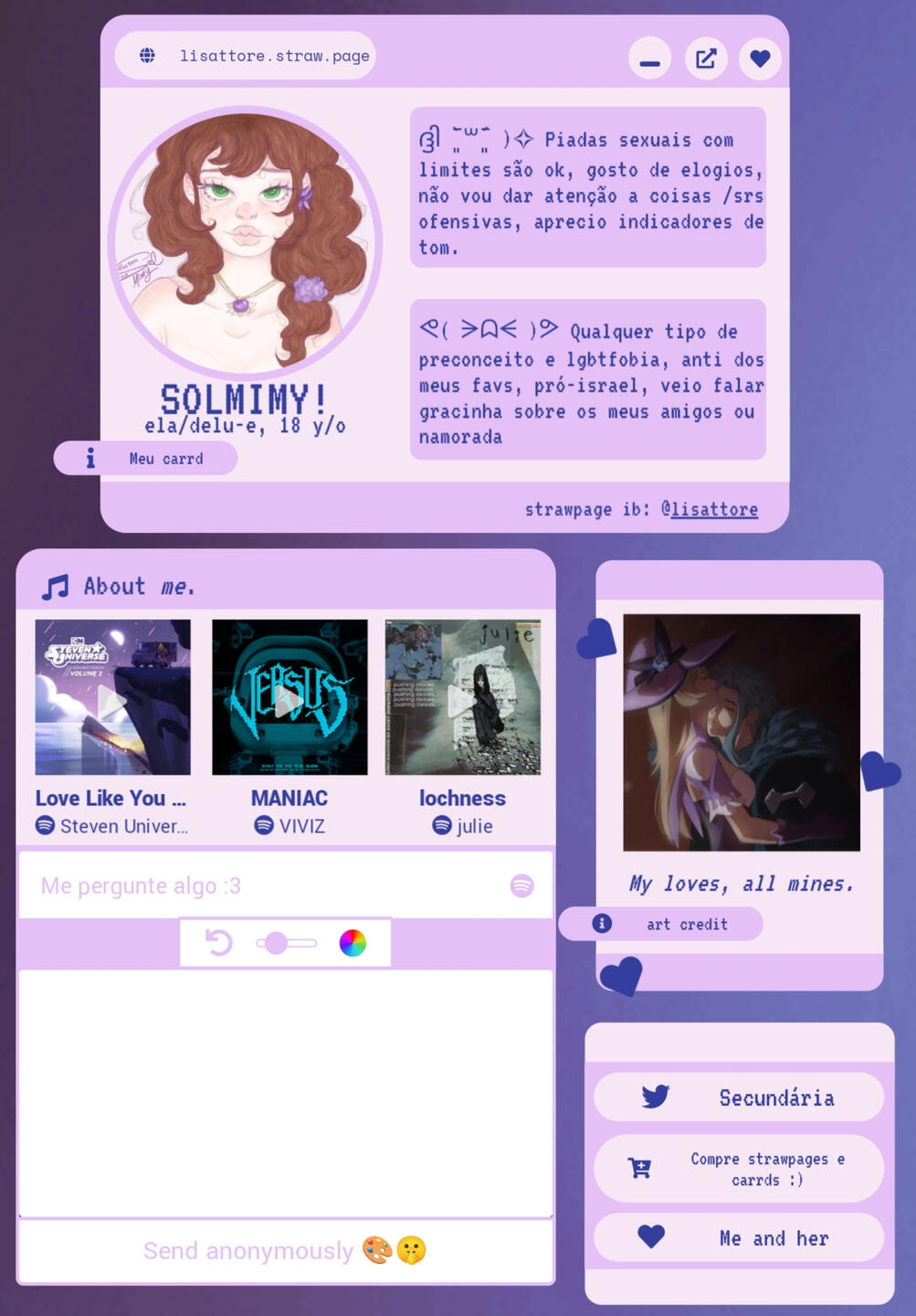 Hi! I've been a carrdmaker for a while now, maybe you've seen a carrd made by @lisattore or @xerelisa somewhere, and that's me!! I make authored carrds and random ones from the internet, always giving credits in that case :)+, before commissioning, read the T.O.S carefully, please+²: Remember to also pay attention to commission statuses!!